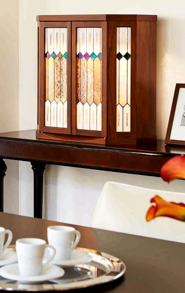 近年、人々の宗教離れ、宗教観の変化がますます加速化するとともに、日本人の生活様式は、洋風スタイルに大きく変化してきました。部屋のインテリアも畳からフローリング、座布団からイス、ちゃぶ台からダイニング・テーブルへと、リビングを彩る家具も洋式が一般化しています。そこで私どもはこのような住宅環境や宗教意識の変化に着眼し、「仏壇のあるリビング」「自由に祀る現代仏壇」をテーマに「現代仏壇」を提案していこうと思っています。