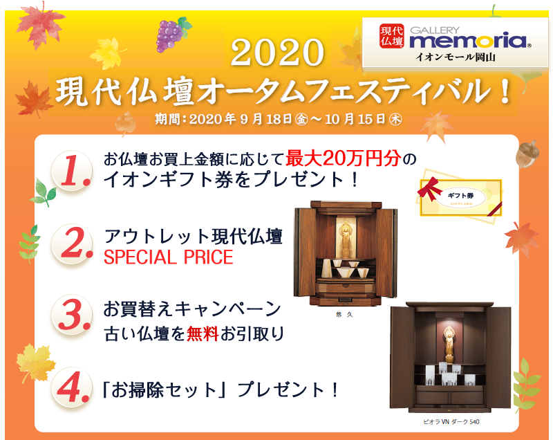 イオンモール岡山店では、2020年9月18日(金)~10月15日(木) の期間で「現代仏壇オータムフェスティバル!」を開催いたします。