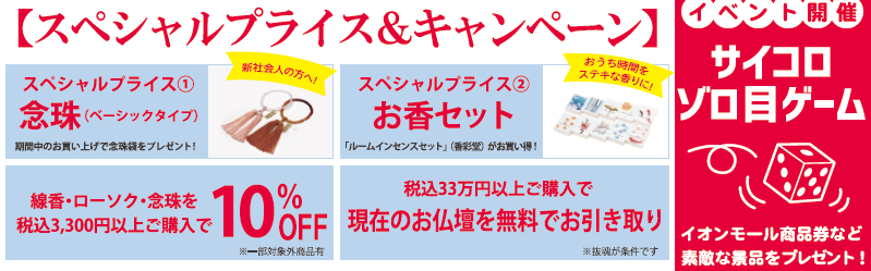 目玉として、特別価格の現代仏壇をご用意の他、スペシャルプライス&キャンペーンも行っています。