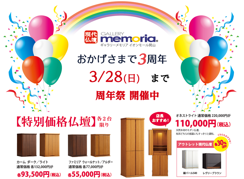 ギャラリーメモリアイオンモール岡山店の3周年は、28日(日)までです。