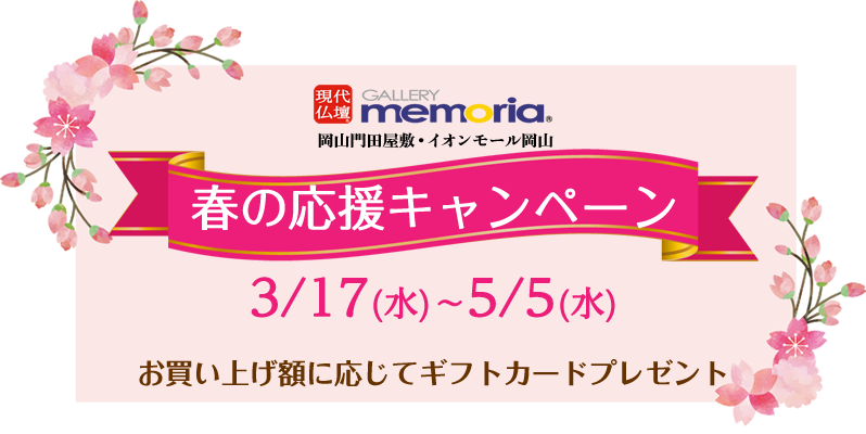 ギャラリーメモリア岡山門田屋敷とギャラリーメモリア イオンモール岡山ではこの春、お買い上げ額に応じてギフトカードがもらえる「春の応援キャンペーン」を実施いたします。ぜひこの機会にご利用ください!