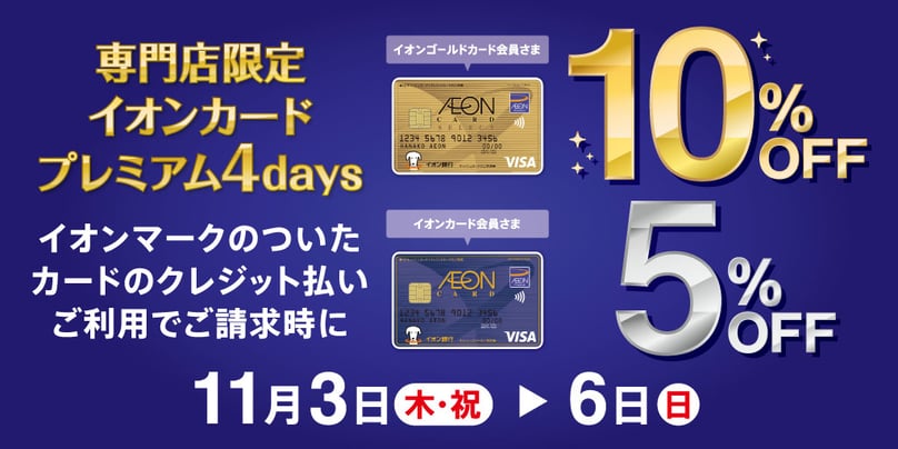 イオンモール岡山店では「イオンマークのカードのクレジット払いご利用で、ご請求時に5~10%OFF」のキャンペーンが始まります。