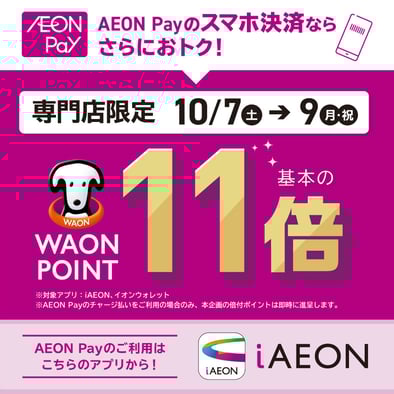 ●イオンモール岡山をご利用のお客様! ①イオンカード払いでWAONPOINTが10倍 ②イオンPay払いでWAONPOINTが11倍10月7日(土)~10月9日(月祝)