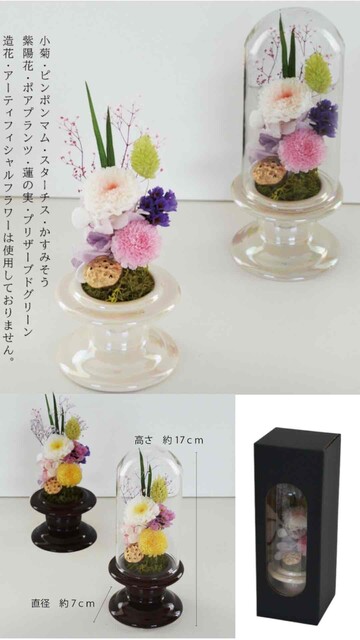上品な陶器の台座の上にガラスドームを載せた、新しいお供え花です。