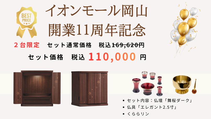 イオンモール岡山の開業11周年を記念し、現代仏壇 ギャラリーメモリアでは数量限定の特別セットをご用意しております。