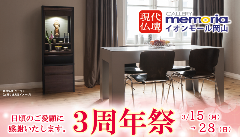ギャラリーメモリアイオンモール岡山店は、おかげさまで3周年を迎えます。 3月15日(月)~28日(日)まで、周年祭を開催いたします。 お得で素敵な商品をラインアップします。 目玉として、特別価格の現代仏壇をご用意しております! スペシャルプライス念珠(ベーシックタイプ)を期間中お買上で念数袋をプレゼント スペシャルプライスのお香セット...