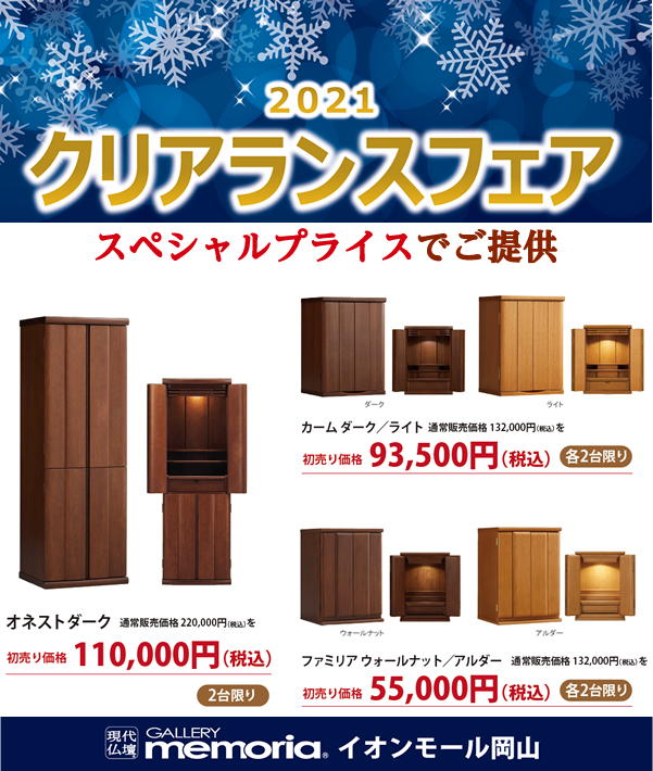ただいま「2021クリアランスフェア」を開催中です。 特別価格のメモリー仏壇など、お仏壇をお買替するのならとてもお買い時!なフェアです 。 是非お得なこのチャンスをご利用ください。 さらに「お買替キャンペーン」も! お買上総額33万円以上で、無料でいまのお仏壇をお引き取り※させていただきます。...
